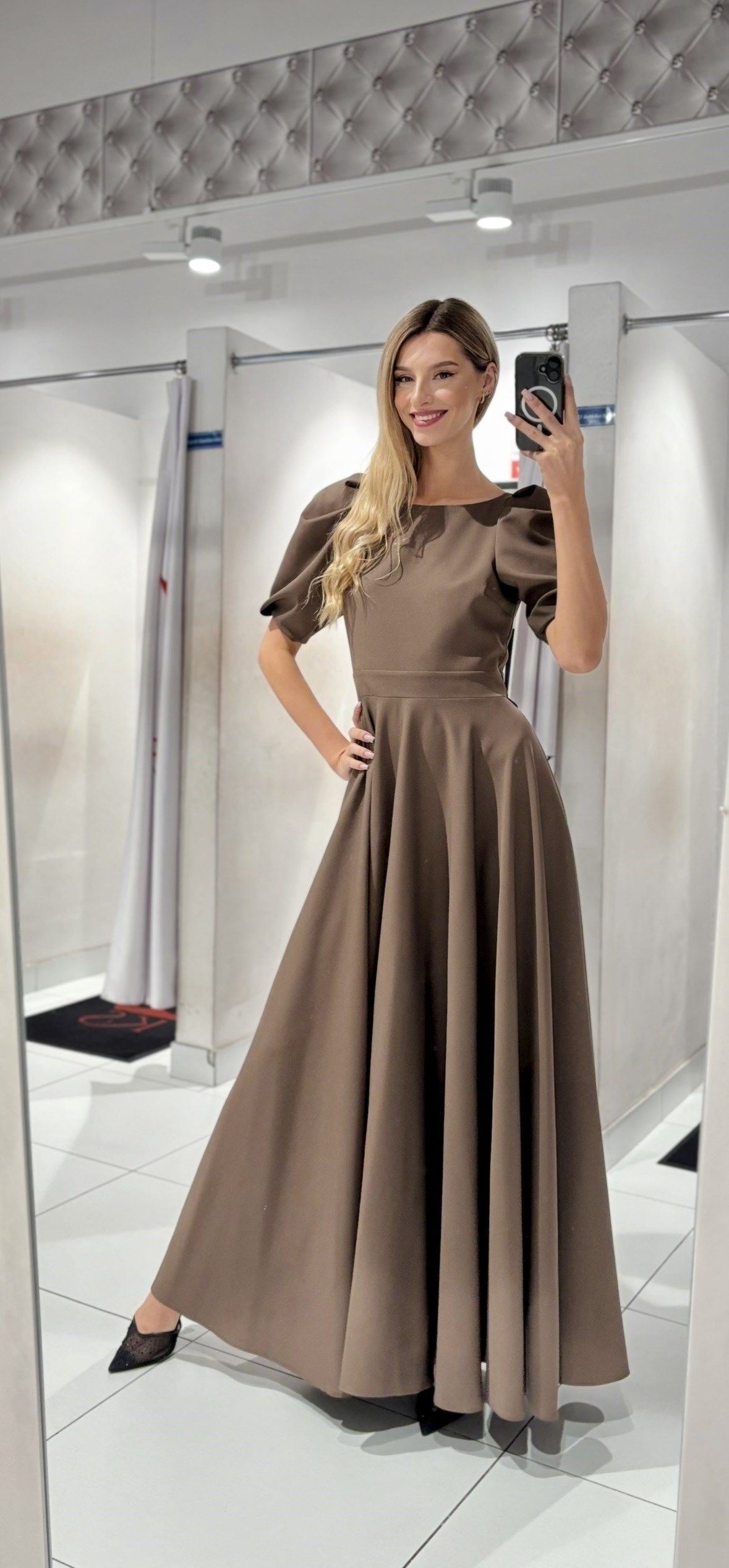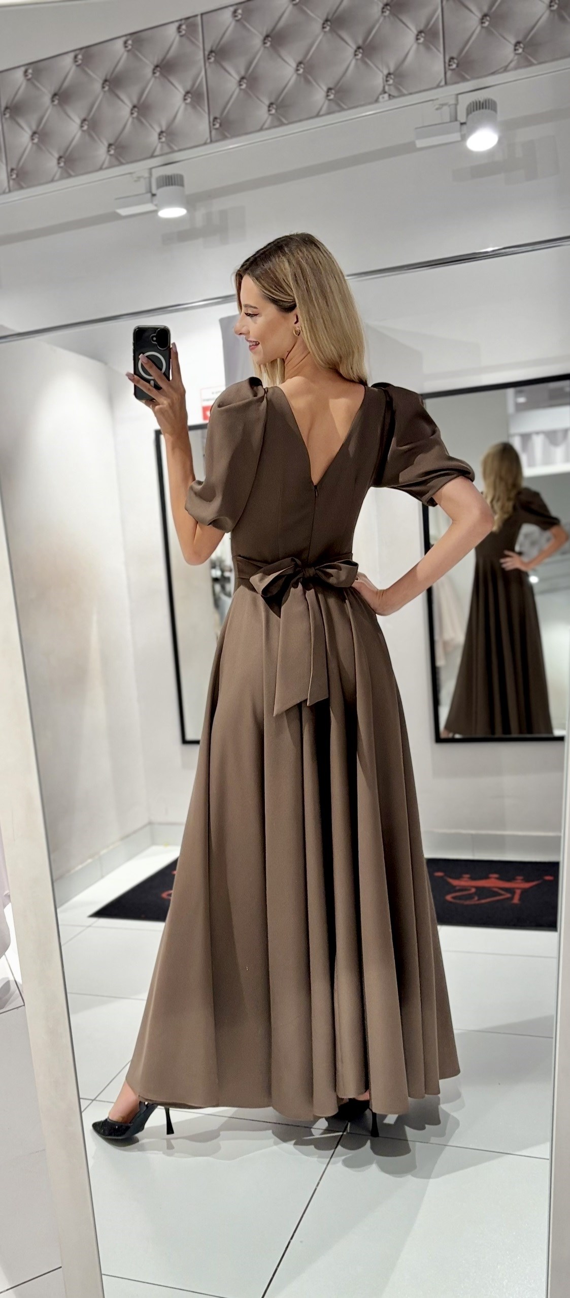 Sukienka długa 3/4 rękawek wiązanie plecy kawa