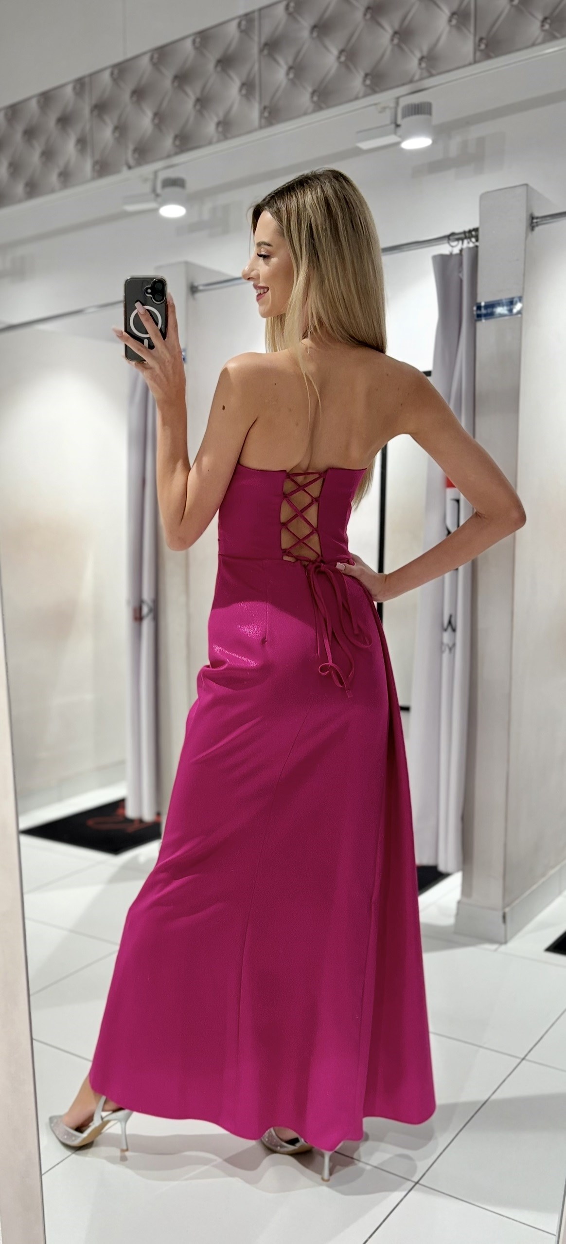 Sukienka długa gorset marszczenie błysk fuksja