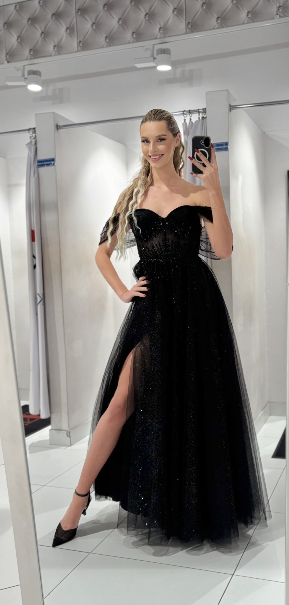 Sukienka długa gorset opadające rękawki tiul czerń