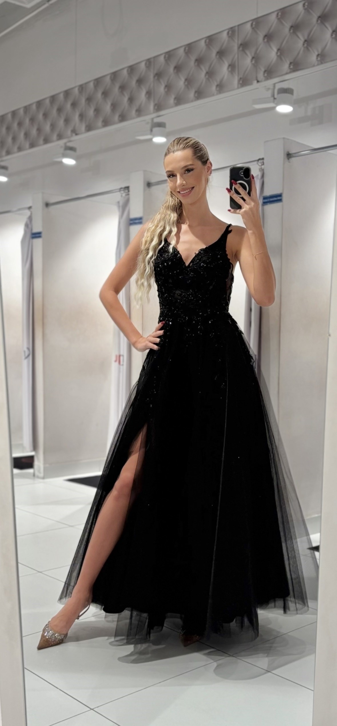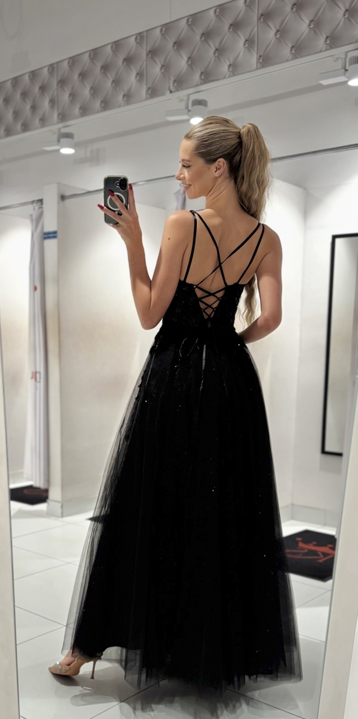 Sukienka długa gorset zdobienie kwiaty tiul czerń