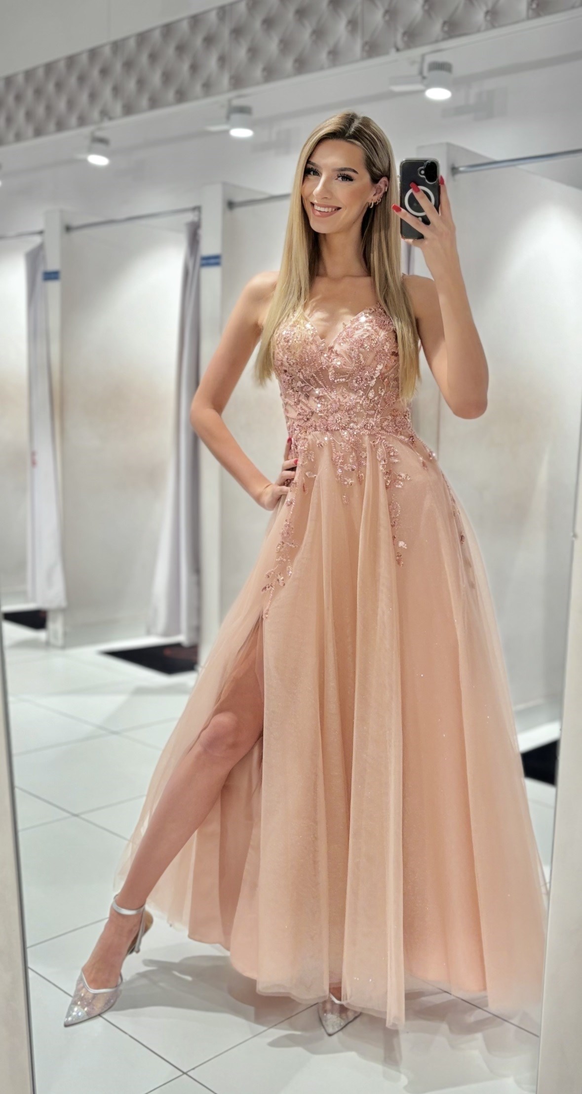 Sukienka długa gorset zdobienie tiul brzoskwinia