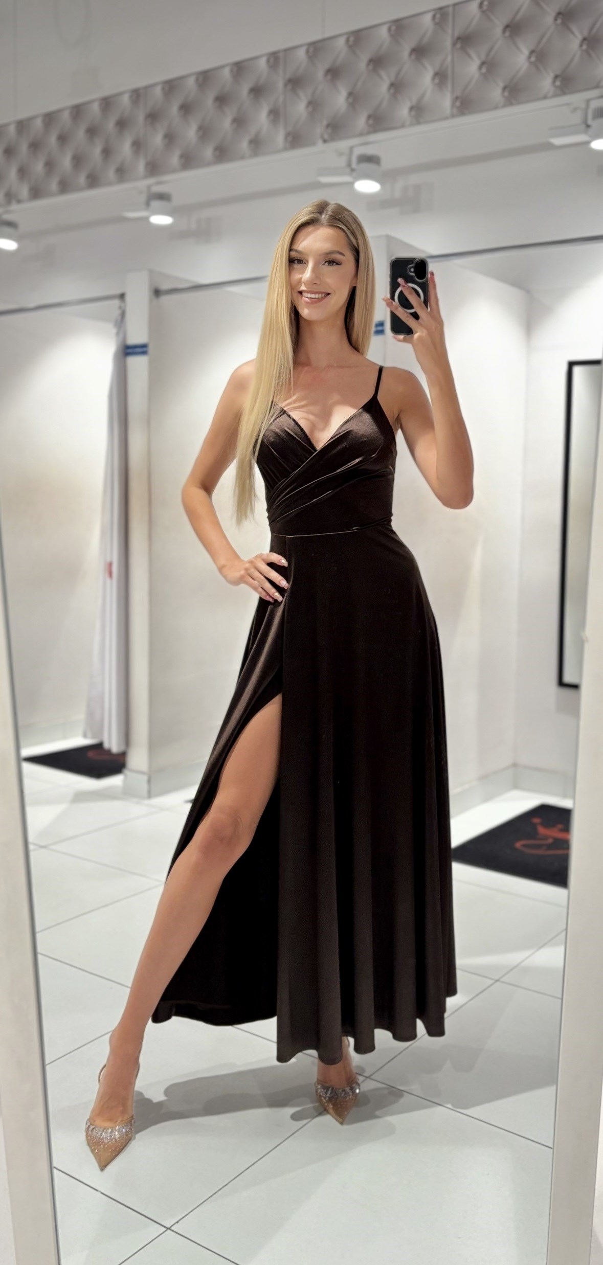 Sukienka długa ramiączka rozkloszowana czekolada