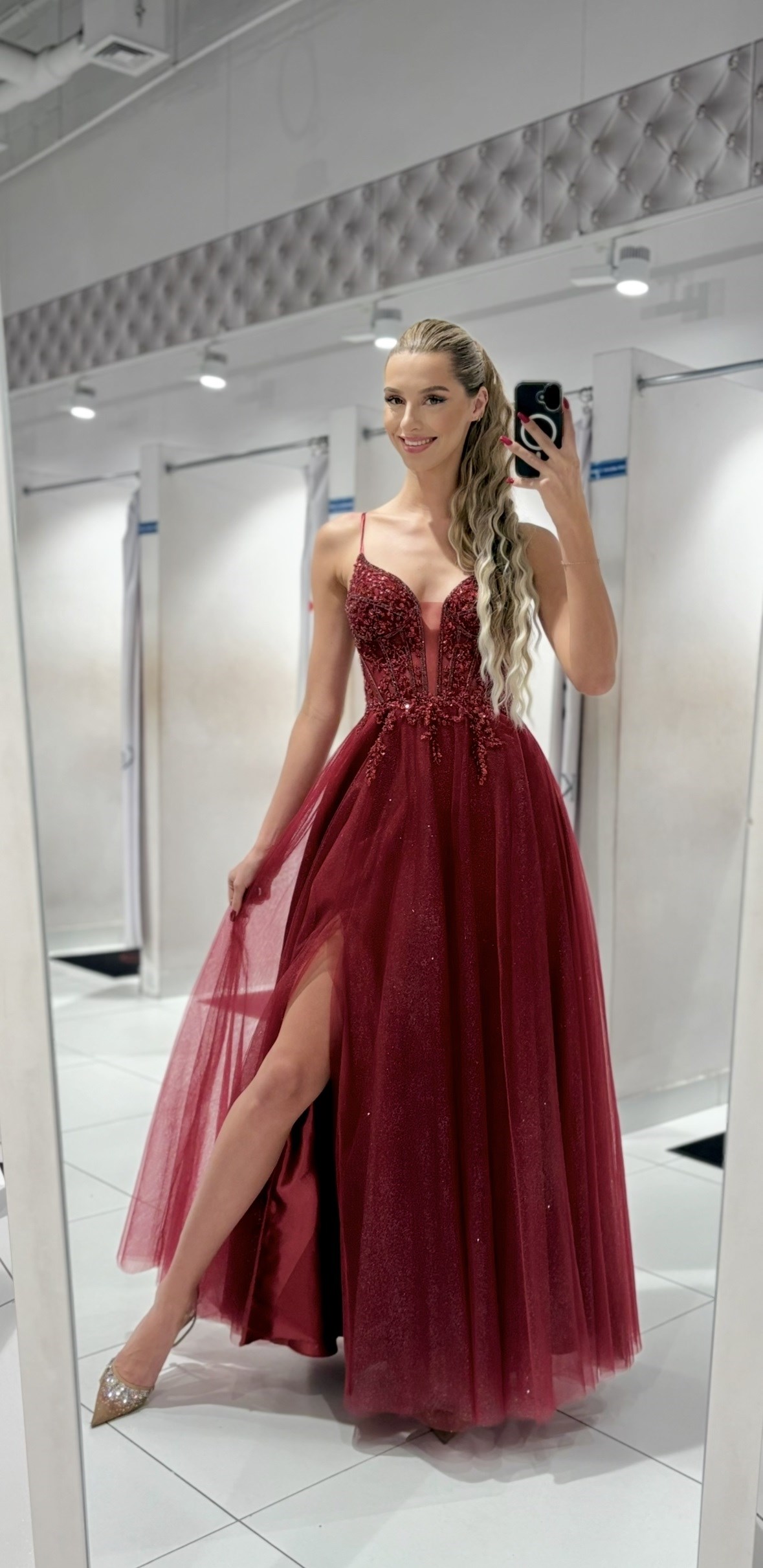 Sukienka długa tiul gorset ozdoby brokat bordo
