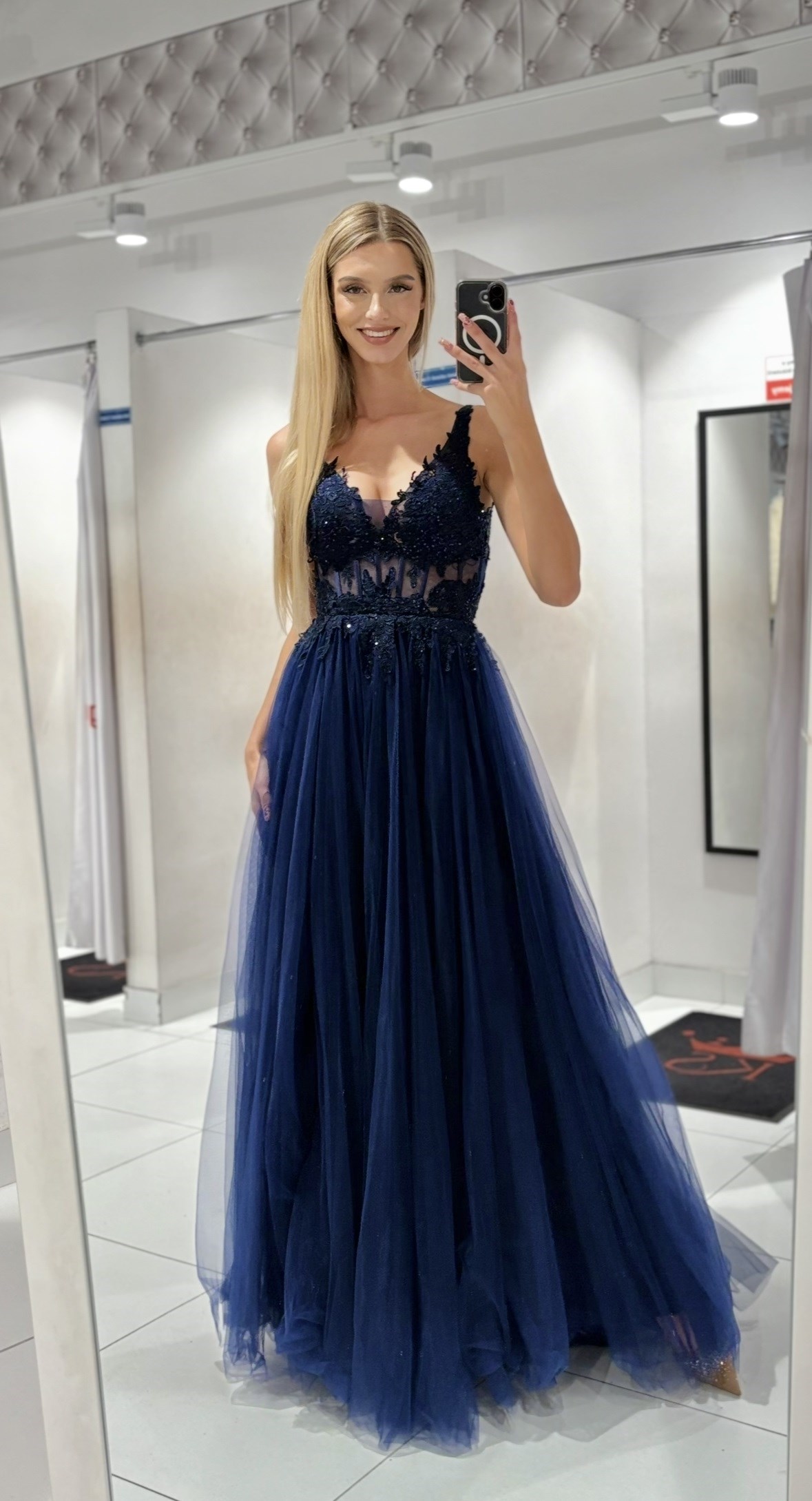 Sukienka długa tiulowa gorset koronka jasny błękit