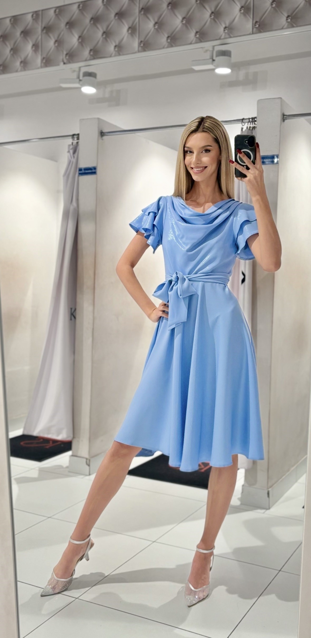 Sukienka krótka rękawek pasek połysk błękit