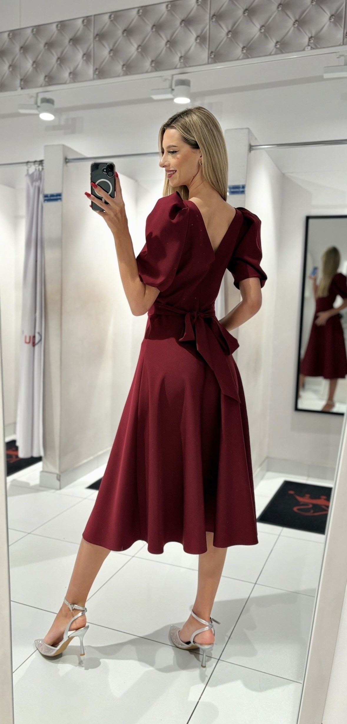 Sukienka midi 3/4 rękawek wiązanie plecy bordo