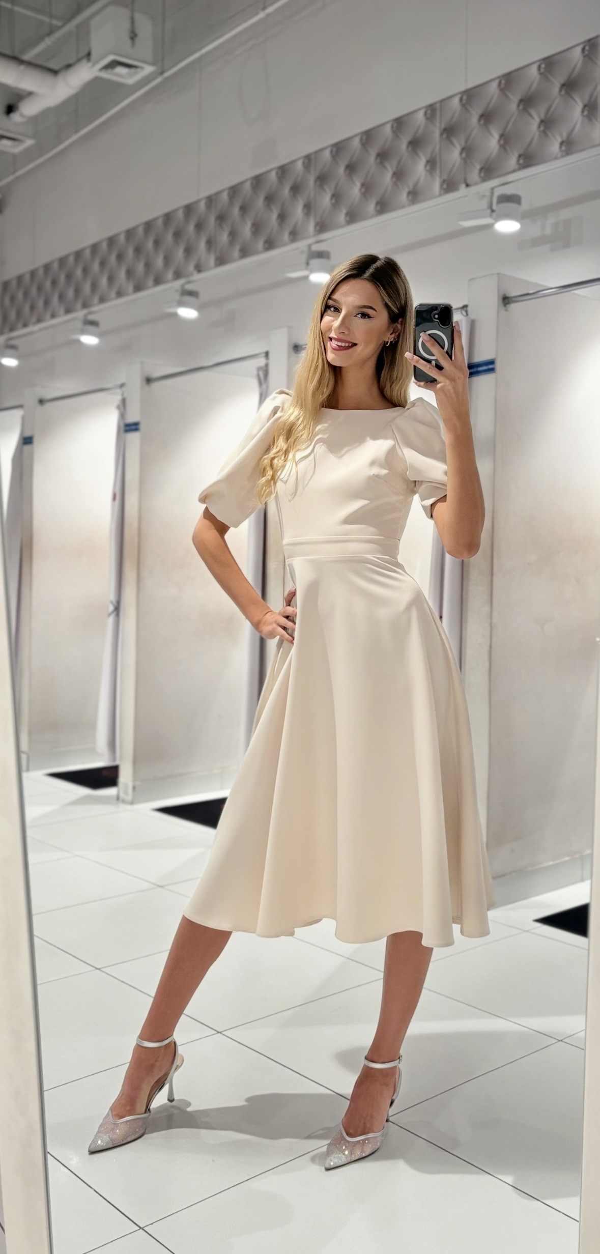 Sukienka midi guziki plecy rękawek wiązanie beż