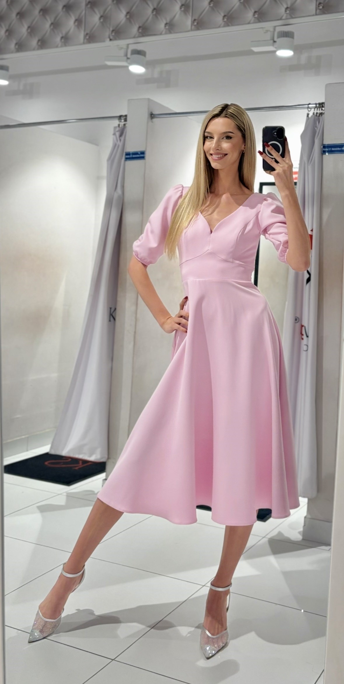 Sukienka midi rękawek 3/4 pas wiązanie puder róż